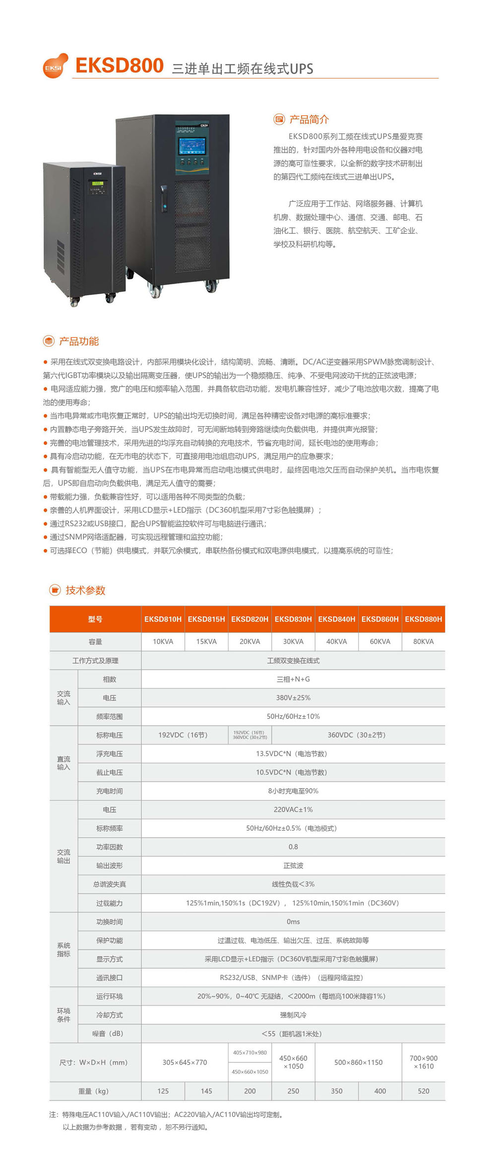 EKSI愛克賽全系列電源產(chǎn)品——愛克賽EKSD800系列塔式三進(jìn)單出工業(yè)級工頻在線式UPS電源